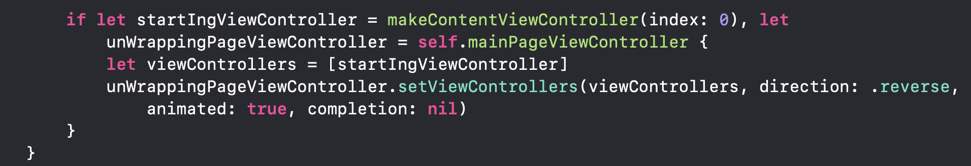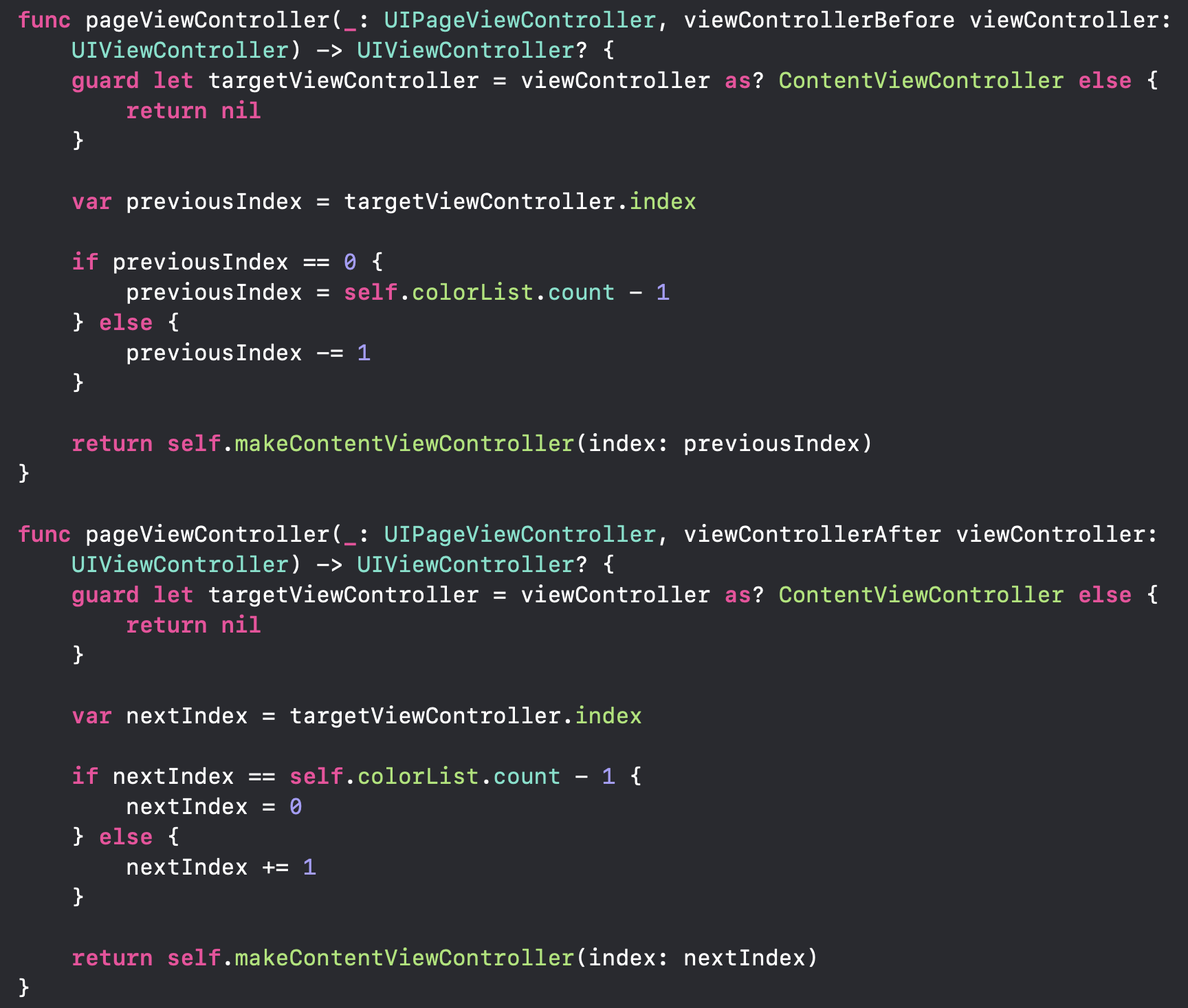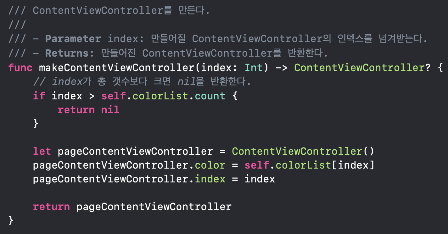 ContentViewController를 만들어주고 그걸 setViewControllers에 넘겨주는 과정입니다.