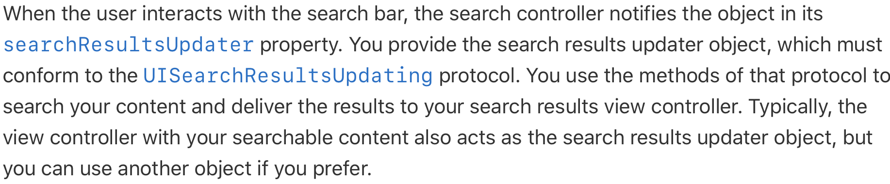 -> search controller는 searchResultsUpdater 속성으로 알림.