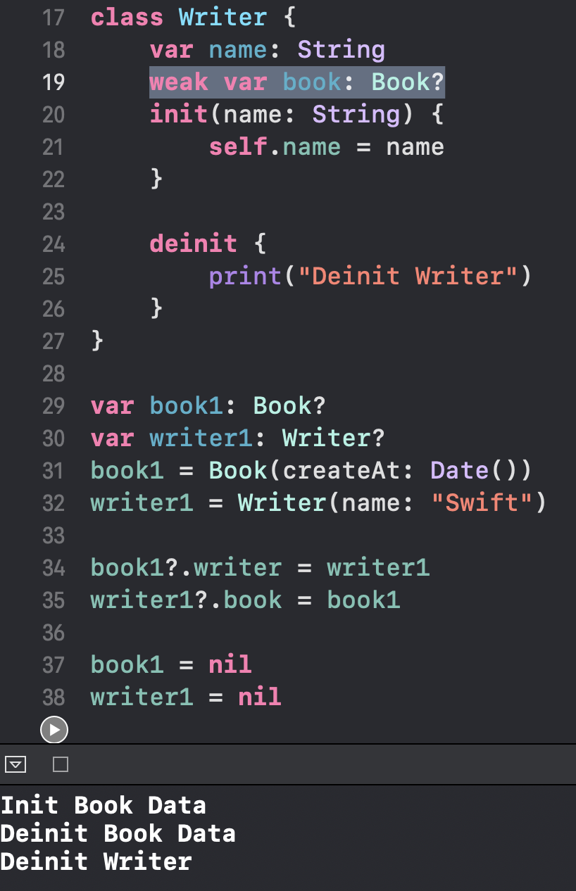 deinit에 있는 print문이 잘 출력되는 것을 볼 수 있습니다