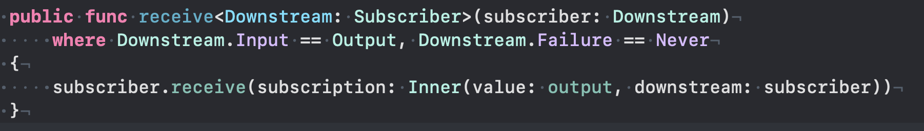 public func receive<S>(subscriber: S) where Output == S.Input, S : Subscriber, S.Failure == Just<Output>.Failure